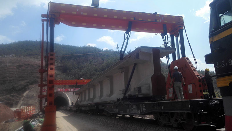 雙線倒裝龍門架是一種跨雙線的梁片或軌排的倒裝龍門架,它可在平車和炮車之間通過橫移方式實(shí)現(xiàn)梁片或軌排的吊裝。既適用于雙線倒裝,也適用于單線倒裝。支起時(shí)內(nèi)部空間可通過機(jī)車。運(yùn)輸時(shí)滿足限界要求。倒裝龍門架主要由增高節(jié)、底架總成、柴油發(fā)電機(jī)、液壓系統(tǒng)、電控系統(tǒng)、導(dǎo)向柱組成、升降機(jī)構(gòu)、護(hù)架組成、起重梁、橫移機(jī)構(gòu)、吊繩裝置、油缸總成等部分組成。